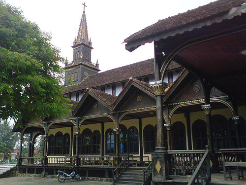 Xe vừa đến cầu ĐakBla lòng tôi bỗng nao nao một cảm giác tươi mới KonTum nhỏ bé xưa cũ đâu còn, giờ đây đường phố rộng thênh thang lầu đài biệt thự san sát, chúng tôi ghé nhà thờ gỗ KonTum ngôi nhà đã hơn trăm năm tuổi vẫn đứng đó trang nghiêm cổ kính mái ngói rêu phong, vẫn lối đi bằng xi măng nhỏ hẹp, vẫn những thảm cỏ mượt xanh, ngôi nhà tọa trên một khoảng đất rộng sàn gỗ đã củ kĩ dấu vết thời gian đã bào mòn, các cửa sổ kính có vẽ hình về các hoạt động của giáo dân từ ngày xa xưa, từ ngày tôn giáo mới lập thành, các màu sơn ánh lên trong mảng tối sáng nổi bật rất đẹp, rất sống động hài hòa. Trước đây cũng có lần tôi đến nhưng tôi không quan sát kĩ như bây giờ. phía trước là tháp nhọn cao vút, rêu bám đầy có hình Chúa ở giữa trong một vòng tròn, đứng giữa sân tôi nhìn lên bầu trời cao và xanh thẳm, có những cụm mây trắng bồng bềnh